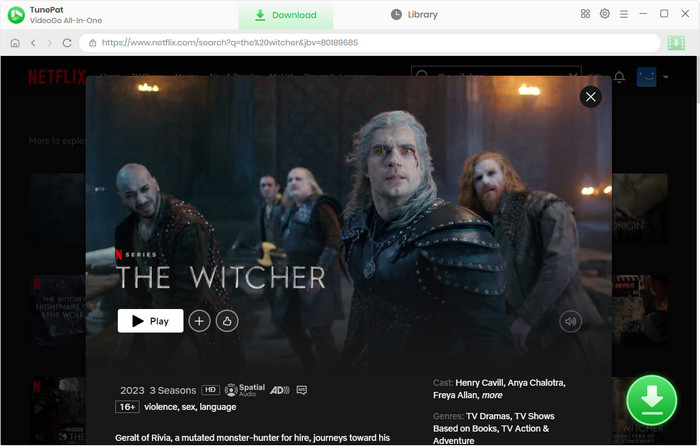 In the built-in web player, click the magnifying glass icon on the top right and enter the video name "The Witcher" to find the video. Or you can directly copy the video's link from the Netflix website on Chrome and paste it into the search bar at the top. After find the video, open it and click the green download icon on the bottom right corner.