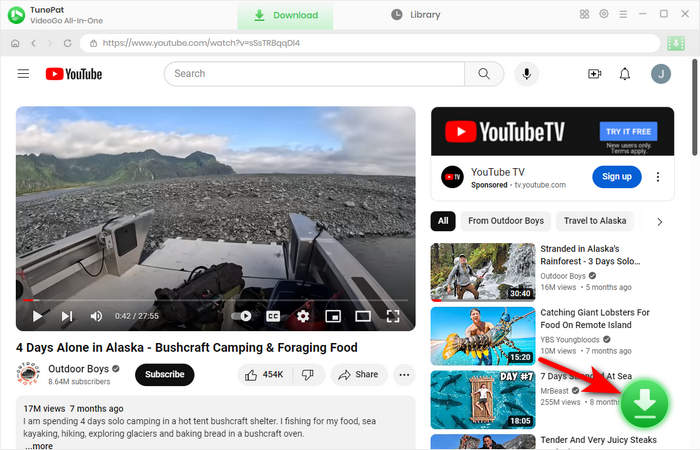 On the built-in YouTube web player, navigate to the video you want to download. Open it and click on the green arrow. The software will automatically analyze the YouTube video.